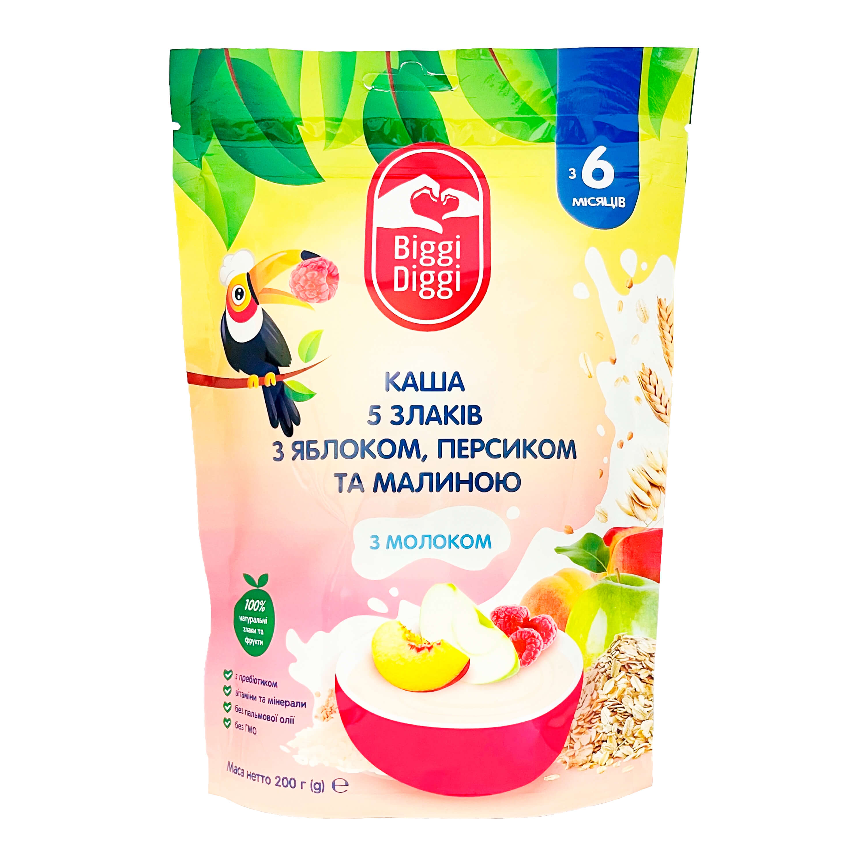 BiggiDiggi Каша молочна 5 злаків з яблуком, персиком та малиною для дітей з 6 місяців 200г