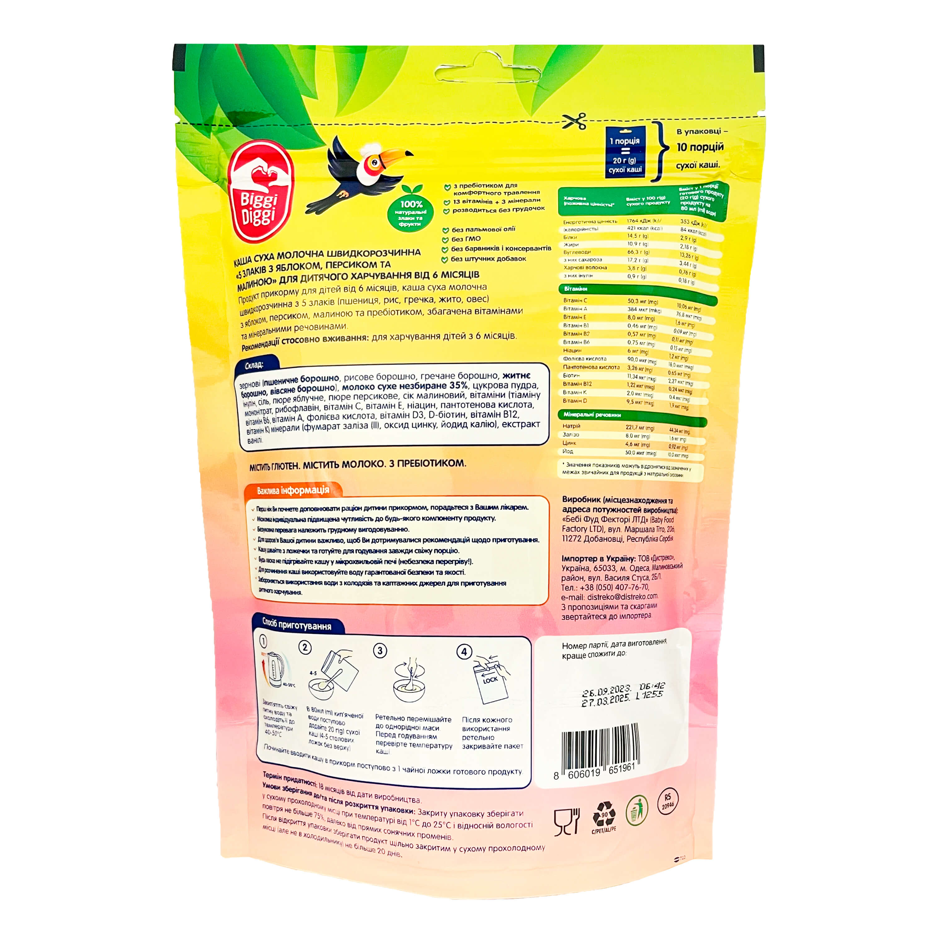 Характеристики BiggiDiggi Каша молочна 5 злаків з яблуком, персиком та малиною для дітей з 6 місяців 200г
