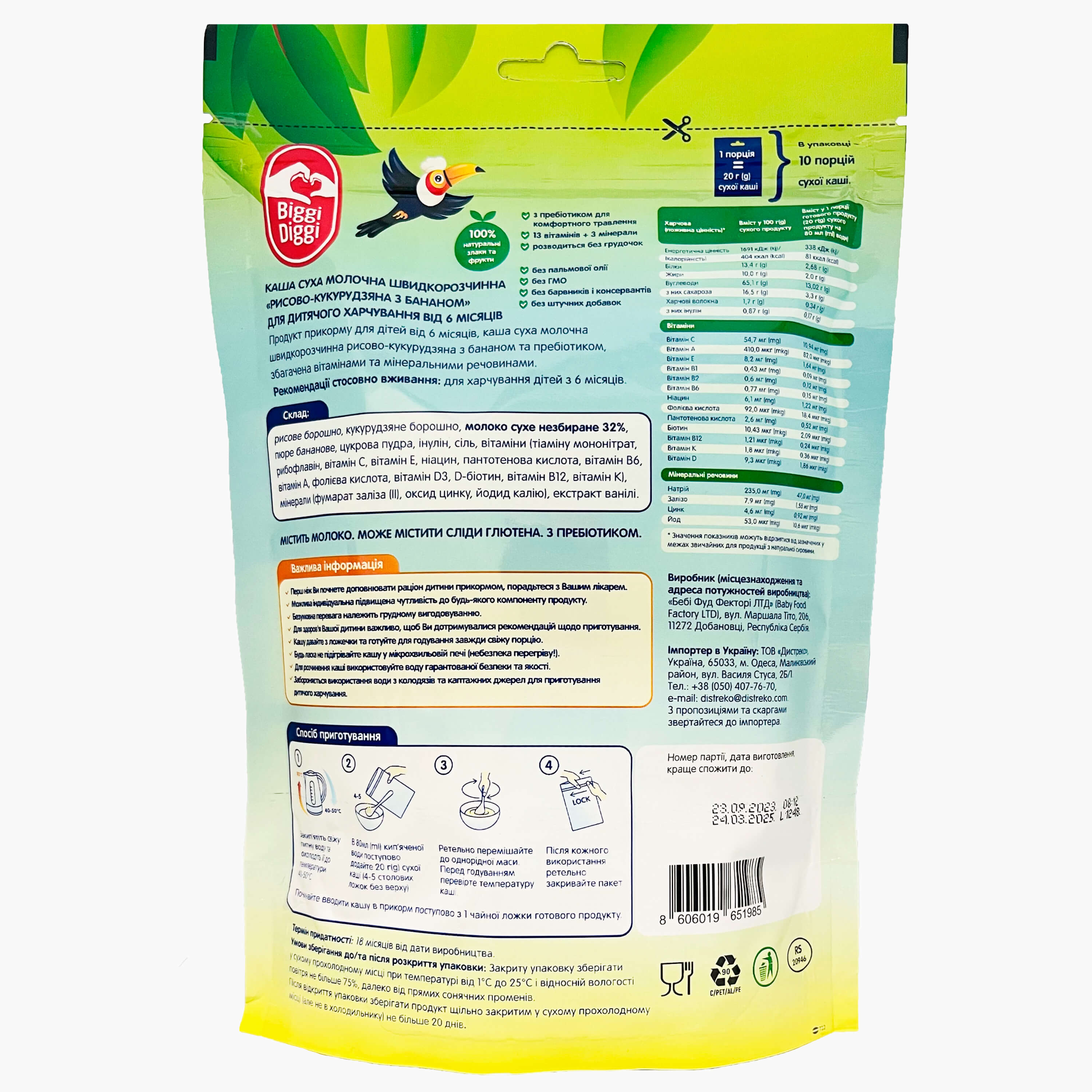 Характеристики BiggiDiggi Каша молочна рисово-кукурудзяна з бананом для дітей з 6 місяців 200г
