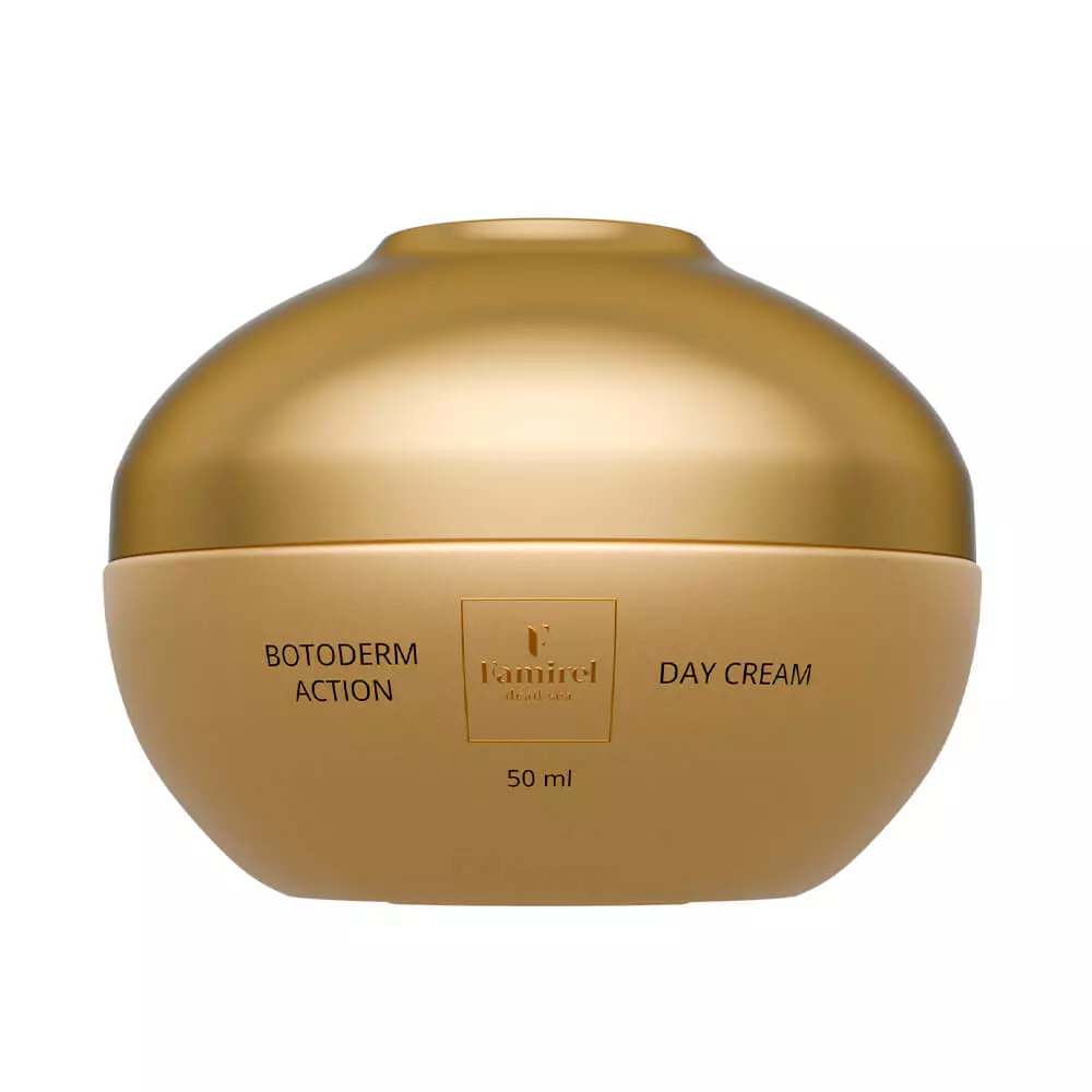 Денний крем Botoderm Action з легкою текстурою, що базується на амінопептиді, який допомагає розслабити м'язи та тимчасово обмежити активність нервових імпульсів, які стимулюють стискання шкіряного покрову, є ефективним засобом у боротьбі з тонкими лініями та зморшками і забезпечує стійкий захист шкіри. Суміш активних інгредієнтів: екстракти огірка, алое, соняшнику, включно з вітаміном Е, Д-пантенолом (провітамін В5), ретинолом (вітамін А), гліцерином, стеариновою кислотою, сприяють регенерації, зволожують, живлять, пом'якшують, надають пружності, підтягнутого вигляду, вирівнюють колір шкіри, а сіль Мертвого моря насичує її мікроелементами і мінералами.
