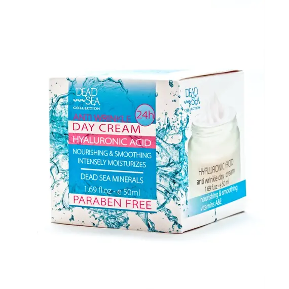 Денний крем з гіалуроновою кислотою та натуральними мінералами Мертвого моря не містить парабенів. Цей крем допомагає живити вашу шкіру і інтенсивно її зволожує. Основна функція гіалуронової кислоти - утримувати вологу, щоб ваша шкіра була добре наповнена вологою. Така формула крему містить природні мінерали Мертвого моря, які допомагають вашій шкірі зменшити поява зморшок, а також захищають шкіру від впливу стресу і забруднення навколишнього середовища. Натуральні мінерали Мертвого моря забезпечують глибоке зволоження, збагачуючи вашу шкіру поживними речовинами.