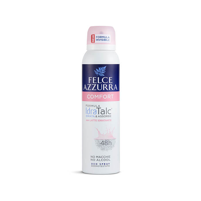 З класичним дезодорантом-антиперспірантом від Felce Azzurra ви почуватиметеся впевнено в будь-яких стресових та емоційних умовах. Засіб сприяє запобіганню появі неприємного запаху і плям на одязі, а також дарує почуття комфорту та свіжості на весь день. Унікальна формула IdraTalc в основі продукту містить талькову пудру та гліцерин, які сприяють не тільки надійному захисту, але й мають інтенсивну зволожуючу дію на ніжну поверхню шкіри.