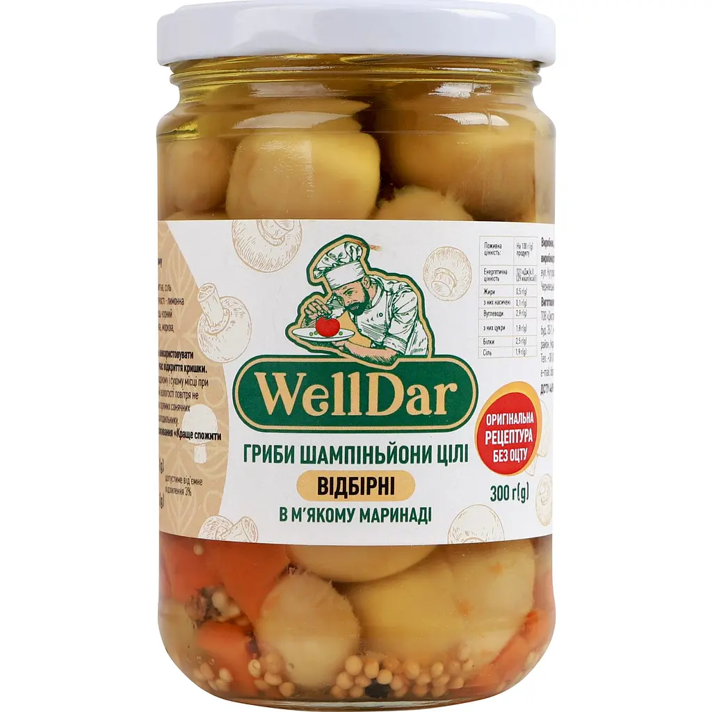 Гриби шампіньйони цілі ВІДБІРНІ в м'якому маринаді 300г ТМ WellDar