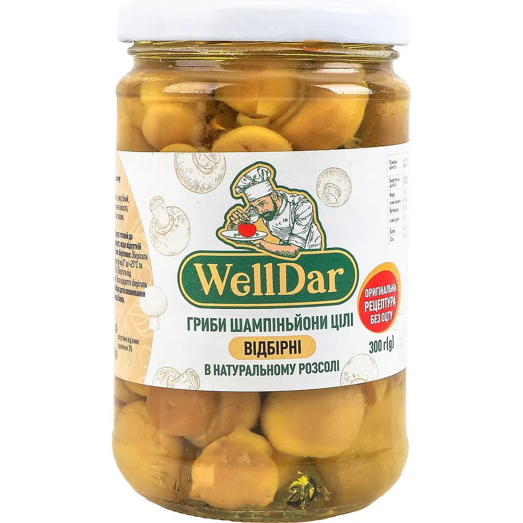 Гриби шампіньйони цілі ВІДБІРНІ в натуральному розсолі 300г ТМ WellDar