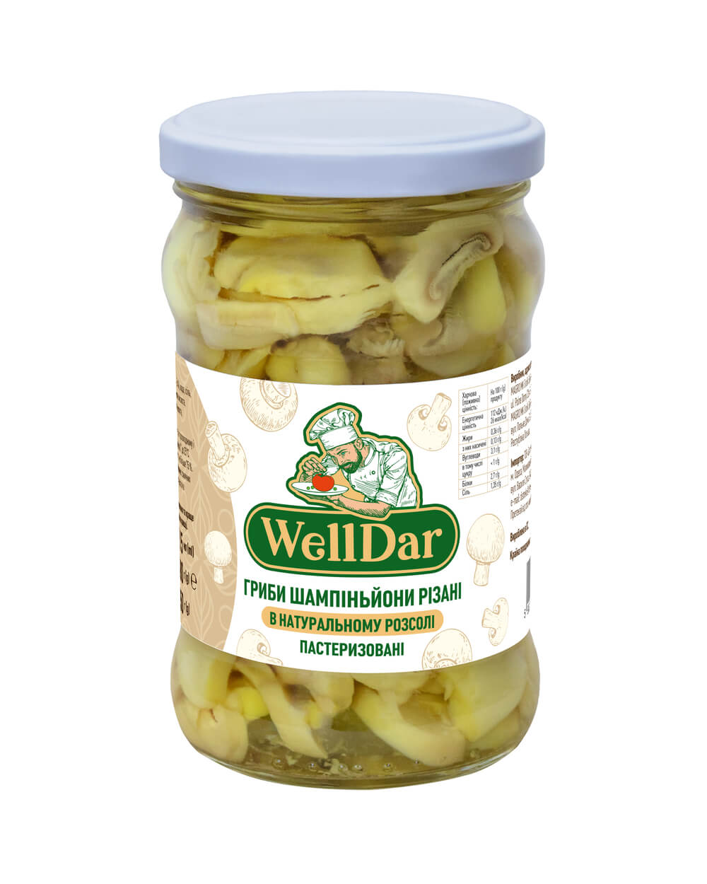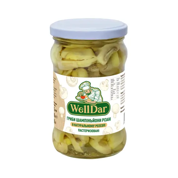 Характеристики Гриби шампіньйони різані в натуральному розсолі 315 мл ТМ WellDar