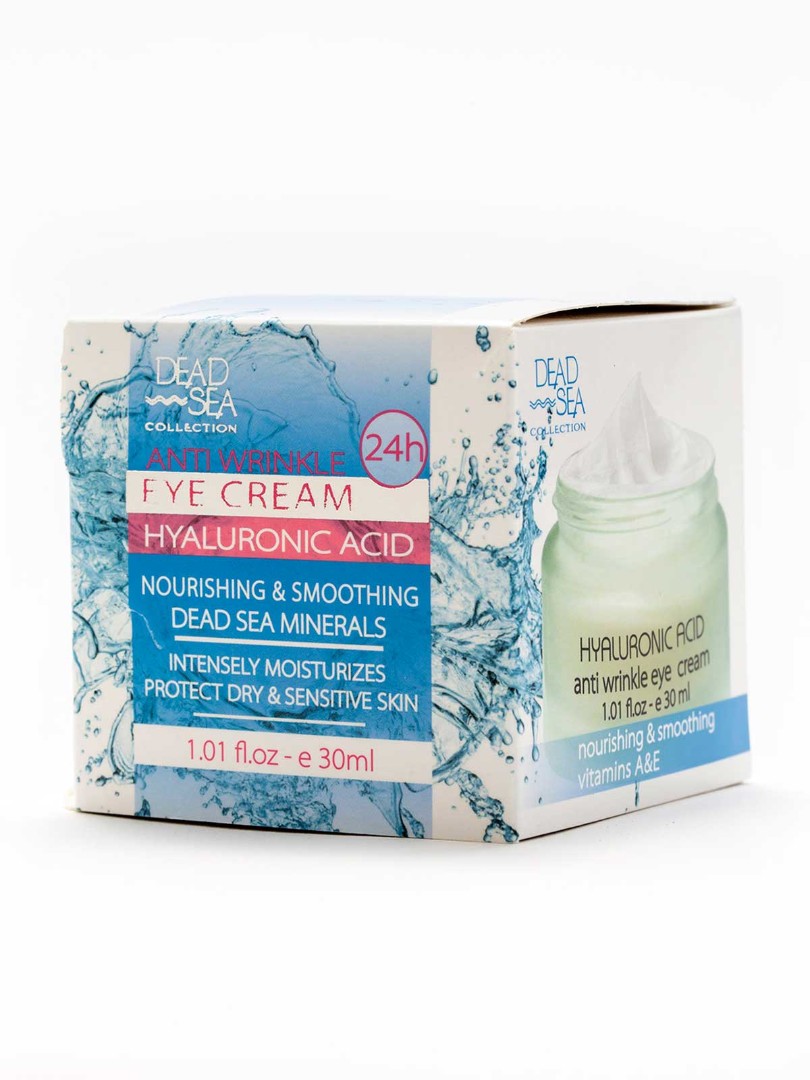 Крем для шкіри навколо очей з гіалуроновою кислотою та натуральними мінералами Мертвого моря не містить парабенів, допомагає живити шкіру навколо очей і інтенсивно її зволожує. Гіалуронова кислота добре відома завдяки її впливу на шкіру, зменшуючи появу тонких ліній і зморшок. Її основна функція - утримувати вологу, щоб ваша шкіра була добре зволожена. Формула крему містить природні мінерали Мертвого моря, які допомагають вашій шкірі зменшити поява зморшок, а також захищають шкіру від впливу стресу і забруднення навколишнього сліди. Натуральні мінерали Мертвого моря забезпечують глибоке зволоження, збагачуючи вашу шкіру поживними речовинами. Для досягнення оптимальних результатів ми рекомендуємо спочатку використовувати нашу сироватку для обличчя з гіалуроновою кислотою, а потім денний крем проти зморшок з гіалуроновою кислотою, збагачений натуральними мінералами Мертвого моря. Вночі ми рекомендуємо використовувати нічний крем для обличчя з гіалуроновою кислотою. Така комбінація засобів по догляду за шкірою була розроблена з використанням натуральних мінералів Мертвого моря і гіалуронової кислоти, які допомагають шкірі отримати глибоке зволоження, необхідне для її оновлення та омолодження, допомагаючи надати вашому обличчю більш молодий вид. Продукти серії Dead Sea Collection доступні як для догляду за шкірою обличчя, так і для догляду за тілом.