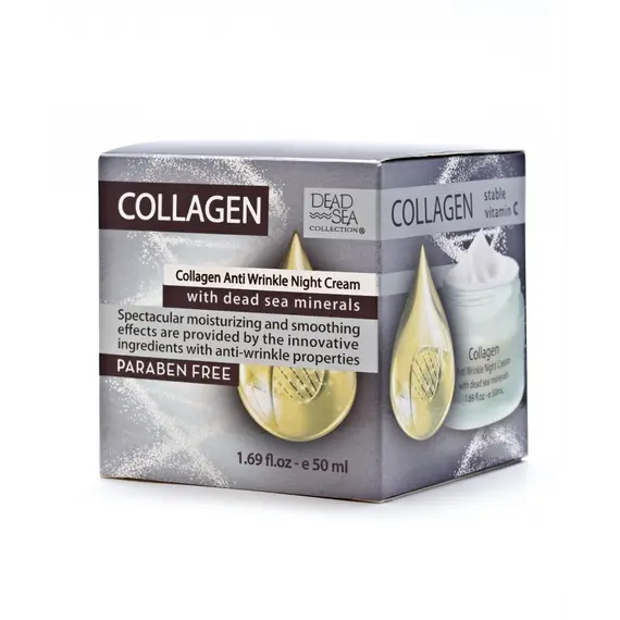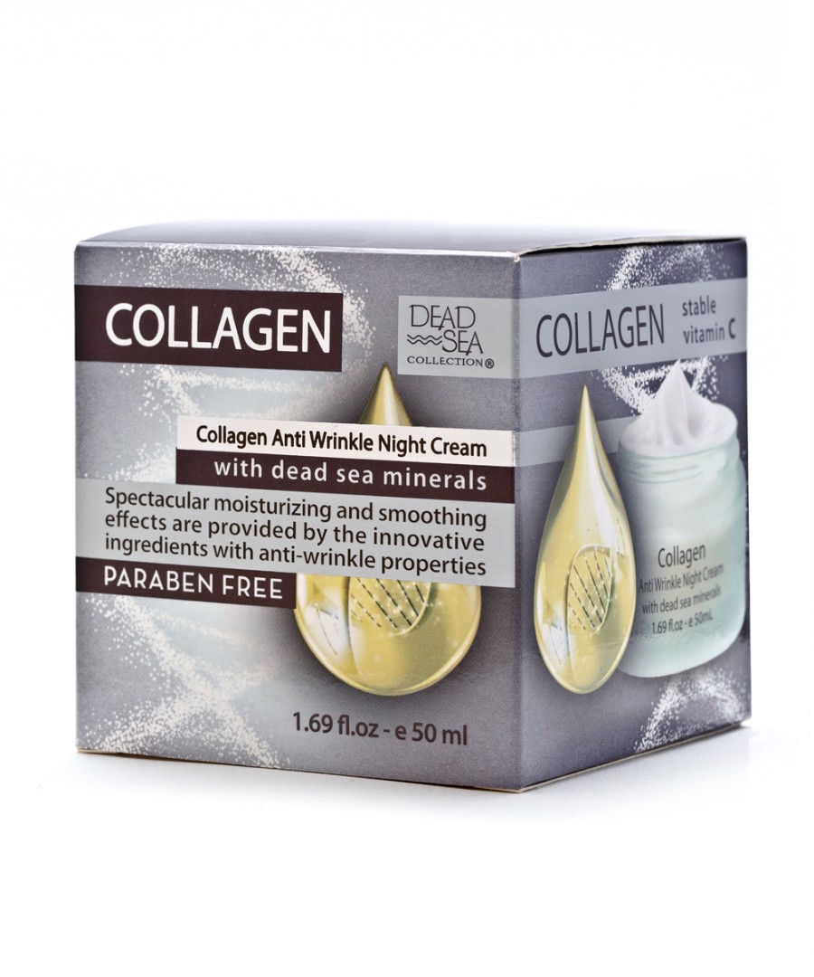 Колагеновий нічний крем проти зморшок з натуральними мінералами Мертвого моря не містить парабенів. Крем збагачений натуральними мінералами Мертвого моря, допомагає зволожити шкіру, зменшити зморшки і захистити шкіру від стресу і забруднення навколишнього середовища. Натуральні мінерали Мертвого моря забезпечують глибоке зволоження, збагачуючи шкіру поживними речовинами. Для досягнення оптимальних результатів ми рекомендуємо спочатку використовувати нашу колагенову сироватку для обличчя і колагеновий крем для шкіри навколо очей, щоб зволожити і відновити зовнішній вигляд шкіри, надаючи їй більш гладкий і природний вигляд. Така комбінація засобів по догляду за шкірою була розроблена з використанням натуральних мінералів Мертвого моря і колагену, які допомагають шкірі отримати глибоке зволоження, необхідне для її оновлення та омолодження, допомагаючи надати вашому обличчю більш молодий вид. Продукти серії Dead Sea Collection доступні як для догляду за шкірою обличчя, так і для догляду за тілом.