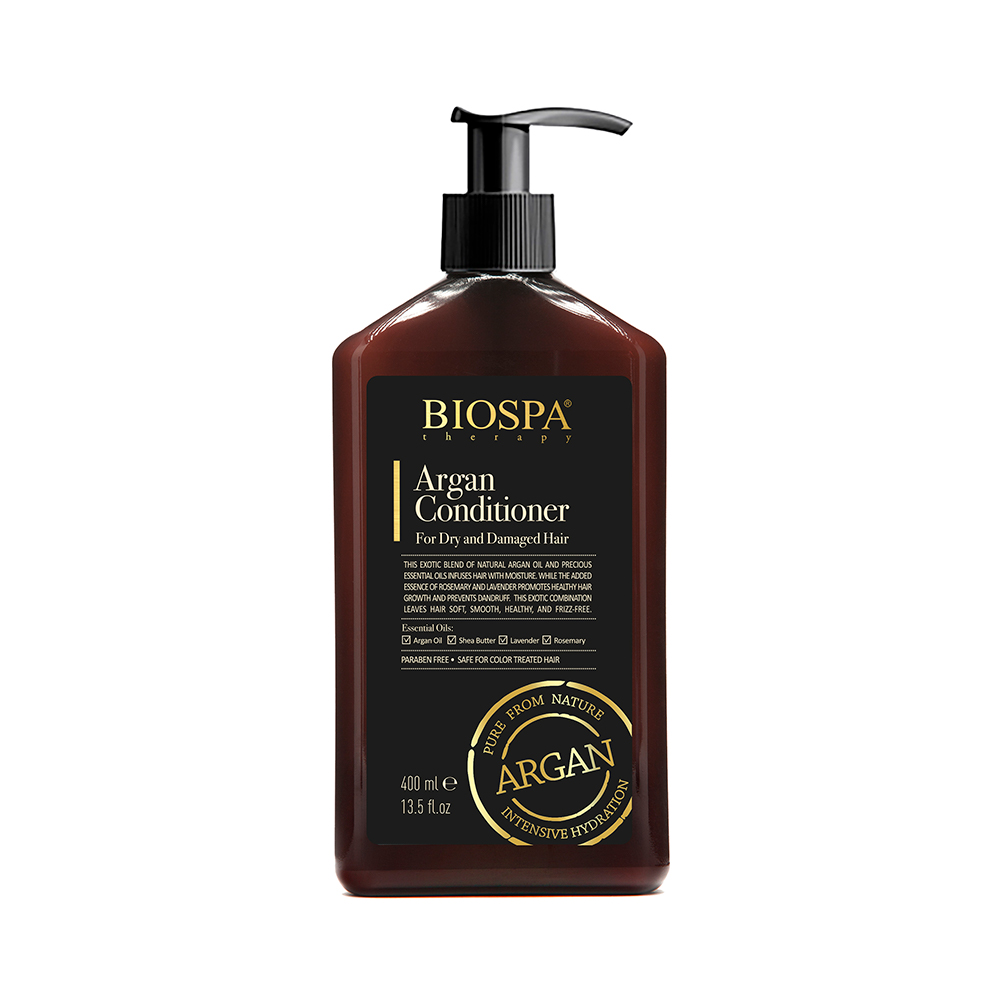 Зволожуючий кондиціонер Bio Spa Argan містить натуральні мінерали Мертвого моря, арганову олію, олію ши, олії лаванди і розмарину для догляду за сухим, пошкодженим і фарбованим волоссям. Олія аргани, олія ши та мінерали Мертвого моря глибоко зволожують пошкоджене волосся, олія лаванди підтримує здоров'я шкіри голови і робить волосся сильнішим, а олія розмарину допомагає запобігти випаданню волосся та утворенню лупи. Робить волосся гладким, здоровим і блискучим.
