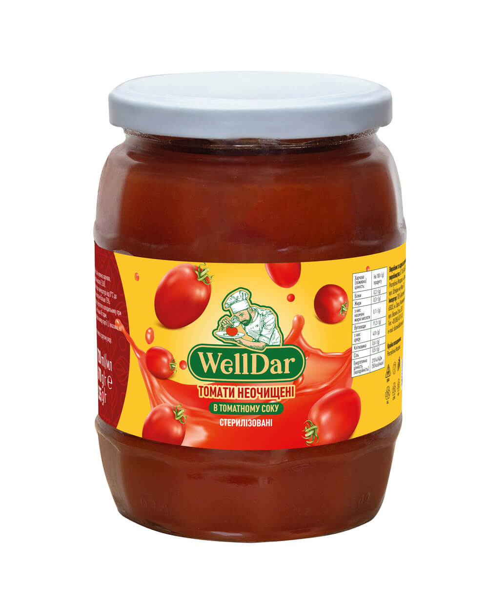 Характеристики Томати неочищені у томатному соку стер с/б 670г ТМ WellDar