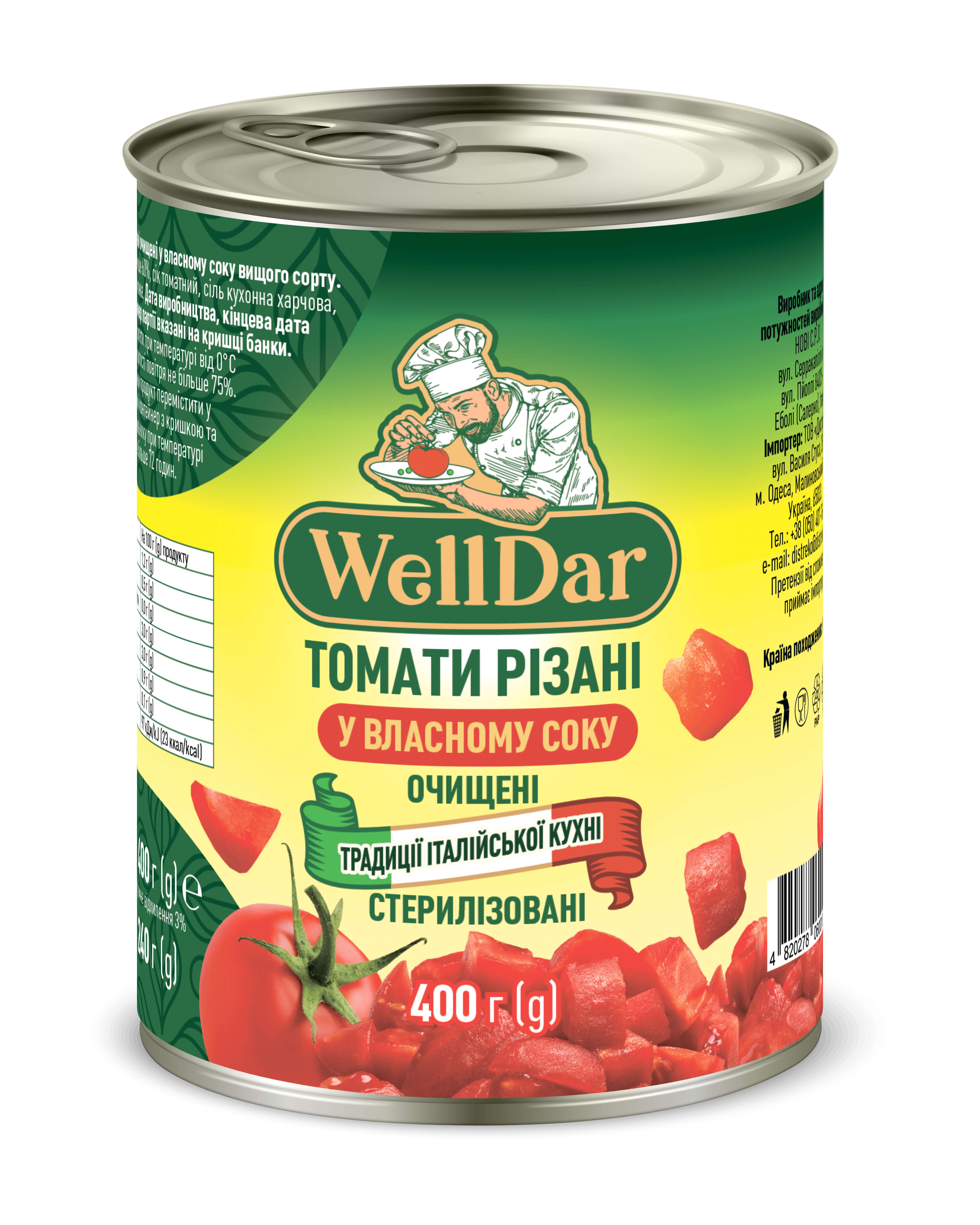 Характеристики Томати різані у власному соку очищені Італійські стерилізовані 400г ТМ WellDar