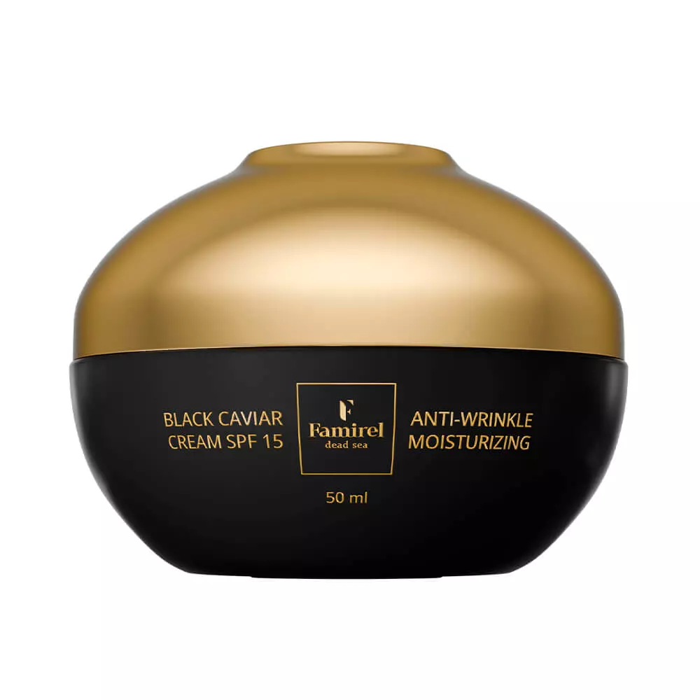 Зволожувальний крем проти зморшок з чорною ікрою забезпечує вашій шкірі оптимальне живлення завдяки складу висококонцентрованих олій і білків. Включає захисний фактор SPF 15, що оберігає шкіру від UVA і UVB променів. Формула крему містить капсульований вітамін Е, який активується при нанесенні, поживну оливкову олію, заспокійливі екстракти ромашки, зеленого чаю, зволожувальне алое вера і цінні мінерали Мертвого моря. Крем інтенсивно зволожує і живить шкіру, надаючи їй відчуття комфорту і свіжості.